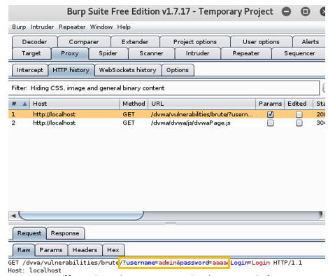Burp Suite의 Proxy -> HTTP history로 가서 가장 최근의 요청을 보면 내가 입력한 username과 password를 확인할 수 있다.