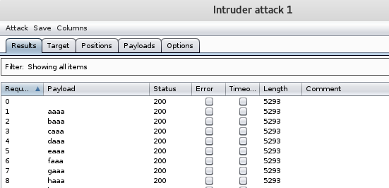 Start attack 버튼을 누르면 아래와 같이 대입 공격이 시작 된다.