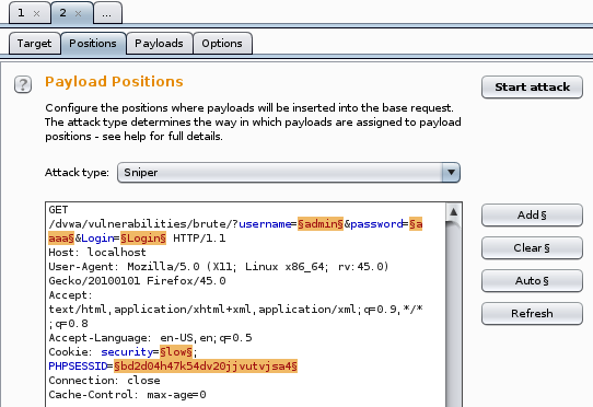 Positions 탭으로 가보자. 아래와 같이 몇 가지 영역이 자동으로 선택되어 있는 것을 볼 수 있는데 이 부분을 쿼리 스트링 이라고 한다. 쿼리 스트링과 쿠키 부분이 일반적으로 사용자가 입력한 값이 서버로 전달되어 변수의 값으로 처리되는 부분이다.