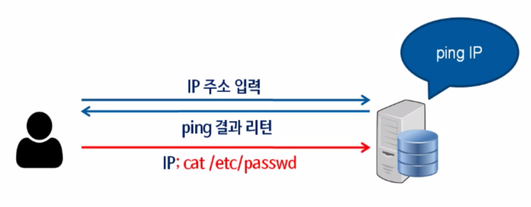 해커가 정상적인 웹페이지에 접속했다고 가정. 이 웹페이지는 서버에서 ping명령어를 실행하고 그 결과를 알려주는 페이지이다. ping 명령어는 ip주소를 가진 어떤 시스템이 현재 동작하고 있는지 확인할 때 사용하는 명령어이다. 이때 해커는 ip주소 뒤에 세미콜론(;)을 입력하고 다른 시스템 명령어를 추가로 전송한다. cat /etc/passwd는 리눅스의 사용자 목록을 확인할 때 사용하는 명령어이다. 만일 웹 application이 해커가 보낸 값이 ip주소 형식을 가진 값인지 제대로 검사하지 않는다면 ping뒤에 해커가 보낸 문자열을 모두 붙여 실행하게 된다.