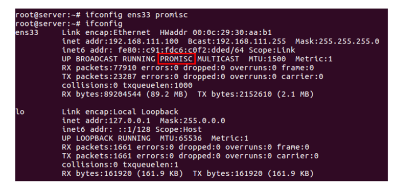 'ifconfig ens33 promisc' 명령으로 ens33 장치를 프러미스큐어스 모드로 바꾼다.