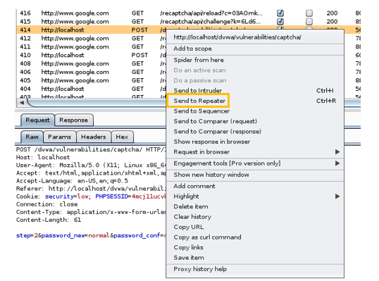 첫 번째 요청을 보면 step 이라는 파라미터에 1이라는 값이 설정 돼있고 우리가 비밀번호로 입력 했던 normal 값이 두 번 나온다. 그리고 recaptcha_challenge_field라는 것이 있는데 이것은 captcha를 확인할 때 매 번 랜덤하게 생성되는 값이