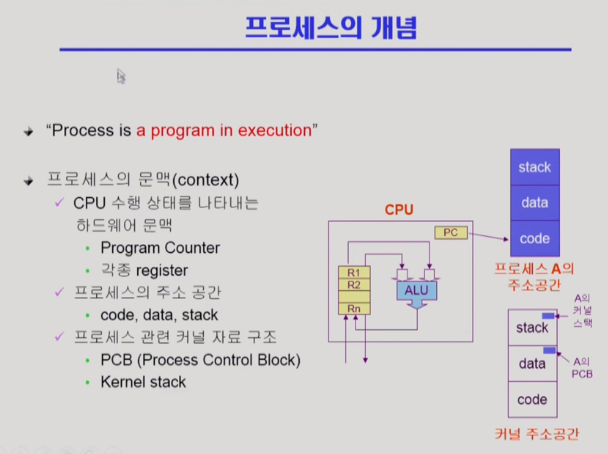 프로세스가 CPU를 점유하게 되면 CPU안의 Program Counter라는 레지스터가 이 프로세스의 code 어느 부분을 가리키게 되고, 매 순간 instruction을 읽으면서 레지스터에 값을 놓고, 연산을 하고, 결과를 레지스터에 저장하거나 메모리에 저장. 이런 식의 진행을 하다가 '어느 시점에는 과연 이 프로세스는 어디까지 와있는 것인가'를 규명하는 것이 이 프로세스의 문맥